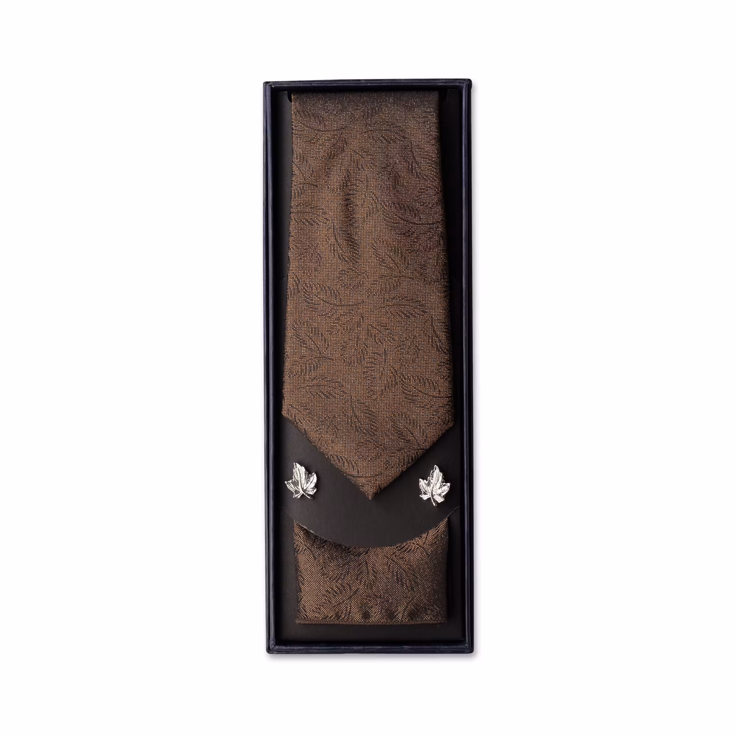 Upptäck ett elegant slipsset i brun ton från edd – en stilfull accessoar med subtilt mönster som ger ett sofistikerat och tidlöst uttryck. Setet innehåller slips, näsduk och manschettknappar, perfekt sammansatta för att skapa en genomtänkt helhet.