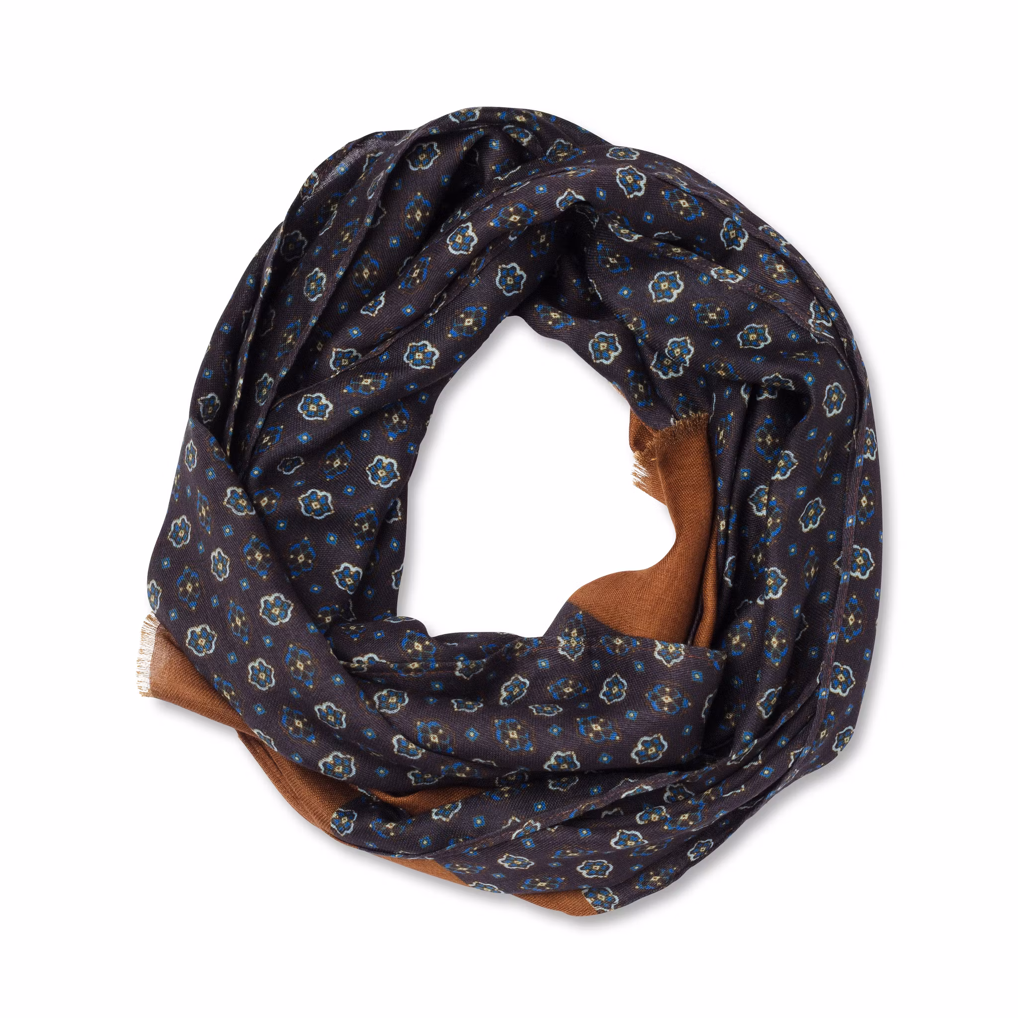 Upptäck en stilren och mångsidig scarf från edd, designad för att ge din outfit en sofistikerad detalj. Den mörkblå basen kombineras med ett diskret mönster i blå toner och en varm brun kontrast i ändarna, vilket skapar ett elegant uttryck som fungerar lika bra till vardags som till mer uppklädda tillfällen.