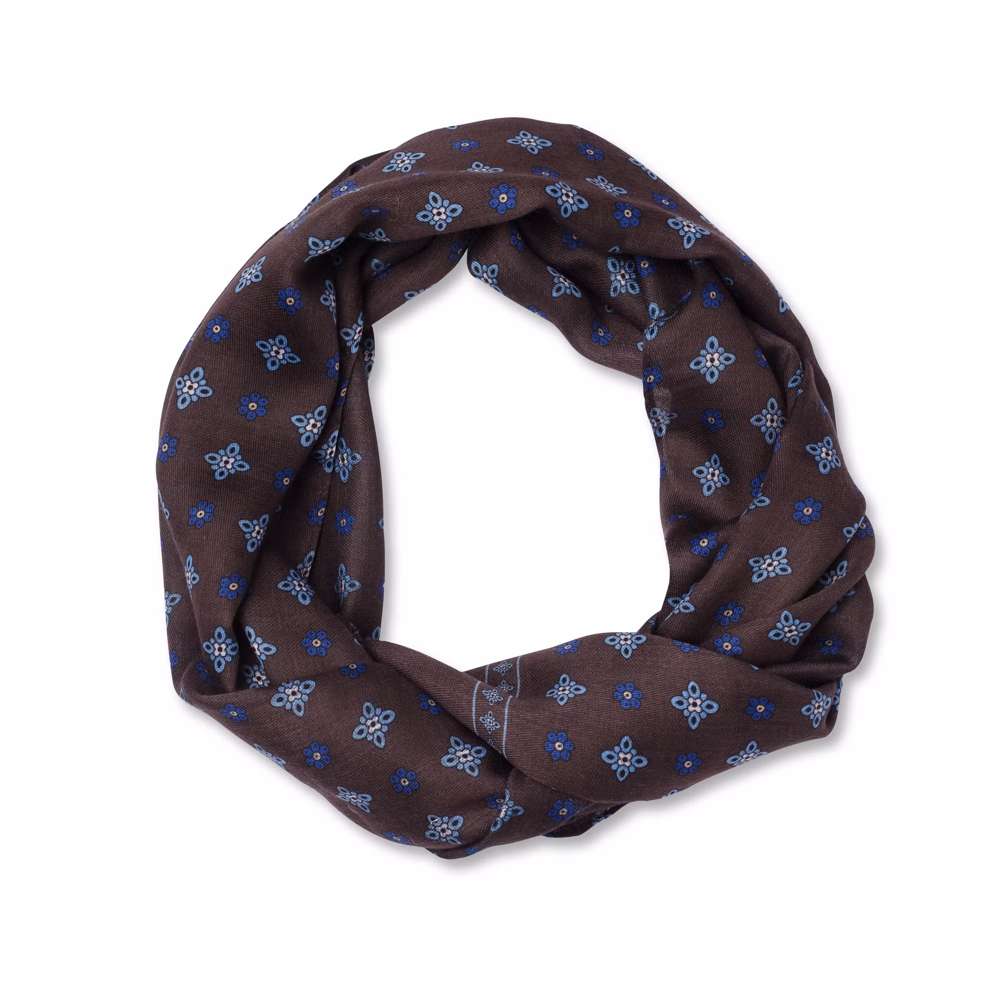 Ge din stil en elegant detalj med denna bruna mönstrade scarf från edd. Den djupa bruna basen kombineras med små dekorativa mönster i blå toner som skapar ett s