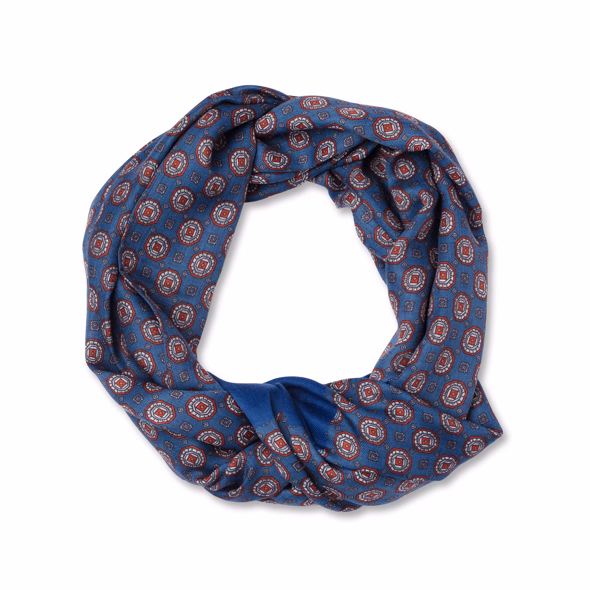 Ge din outfit en elegant detalj med denna mönstrade scarf från edd. Den djupblå basen kombineras med ett stilrent mönster i rött och vitt, vilket skapar ett klassiskt uttryck med modern känsla. Den kontrasterande blå kanten i ändarna ger scarfen en tydlig och sofistikerad finish.