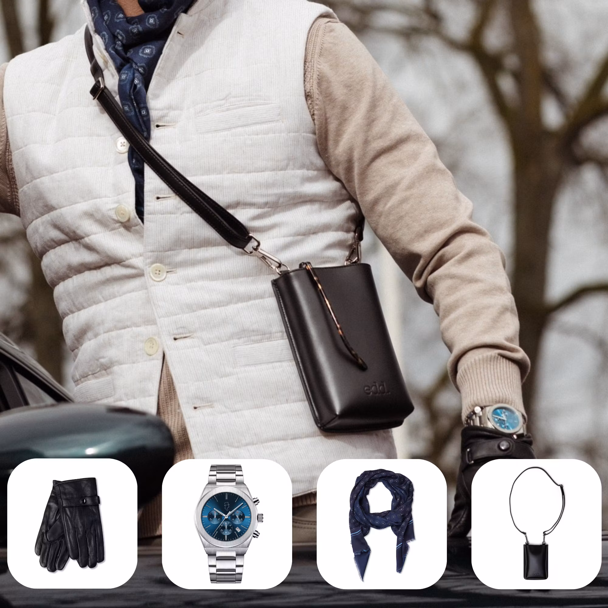 Upptäck Shop the Look från edd – en stilren kombination av handskar, klocka, crossbody väska och scarf som tillsammans skapar en genomtänkt och elegant helhet. Denna look är designad för dig som vill bära en klassisk och modern stil med fokus på detaljer.